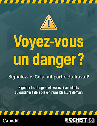 Si vous remarquez un danger réel ou potentiel pour la santé et la sécurité, ou un quasi-accident,dans votre lieu de travail, il est de votre devoir de le signaler immédiatement à votre superviseur.